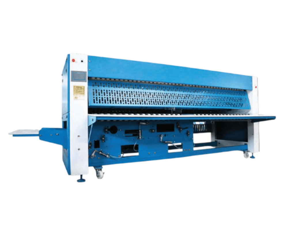 Material exiting the ironer is smoothly and directly fed via a synchronized roller conveyor. This machine’s precision is maintained through a combination of photocell holders and a measuring wheel, ensuring proper feeding and speed. Once inside, the machine executes folds based on your selected program. The initial two folds are achieved with an air knife, followed by three precise folds performed by a mechanical knife, ensuring consistent results.